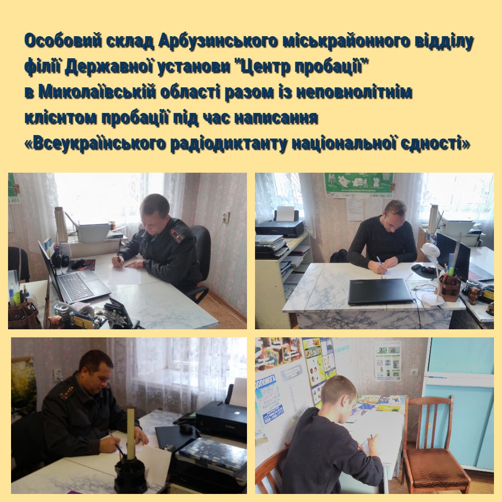 08 листопада працівники Арбузинського міськрайонного відділу філії Державної установи «Центр пробації» в Миколаївській області разом з підобліковим клієнтом пробації приєднались до написання «Всеукраїнського радіодиктанту національної єдності», проведення якого започаткували у 2000 році та який поєднав українців не тільки на території України, але й в усьому світі.