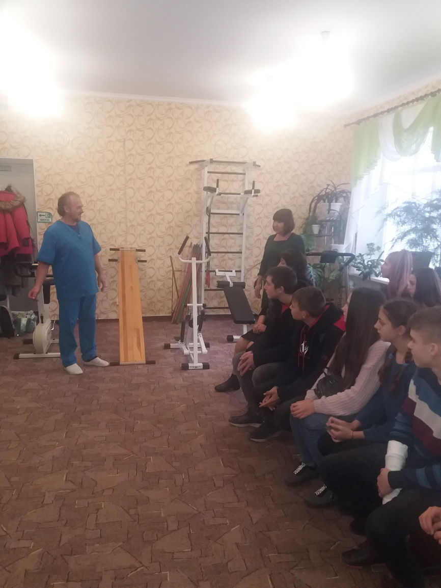 Олег Василенко – фахівець з фізичної реабілітації показав школярам кабінет лікувальної фізкультури, розповів про обладнання з якими працюють, школярі спостерігали як працюють масажні ліжка. Екскурсія продовжилася до тренажерного залу відділення денного перебування територіального центру соціального обслуговування. Учні мали можливість потренуватися на тренажерах.