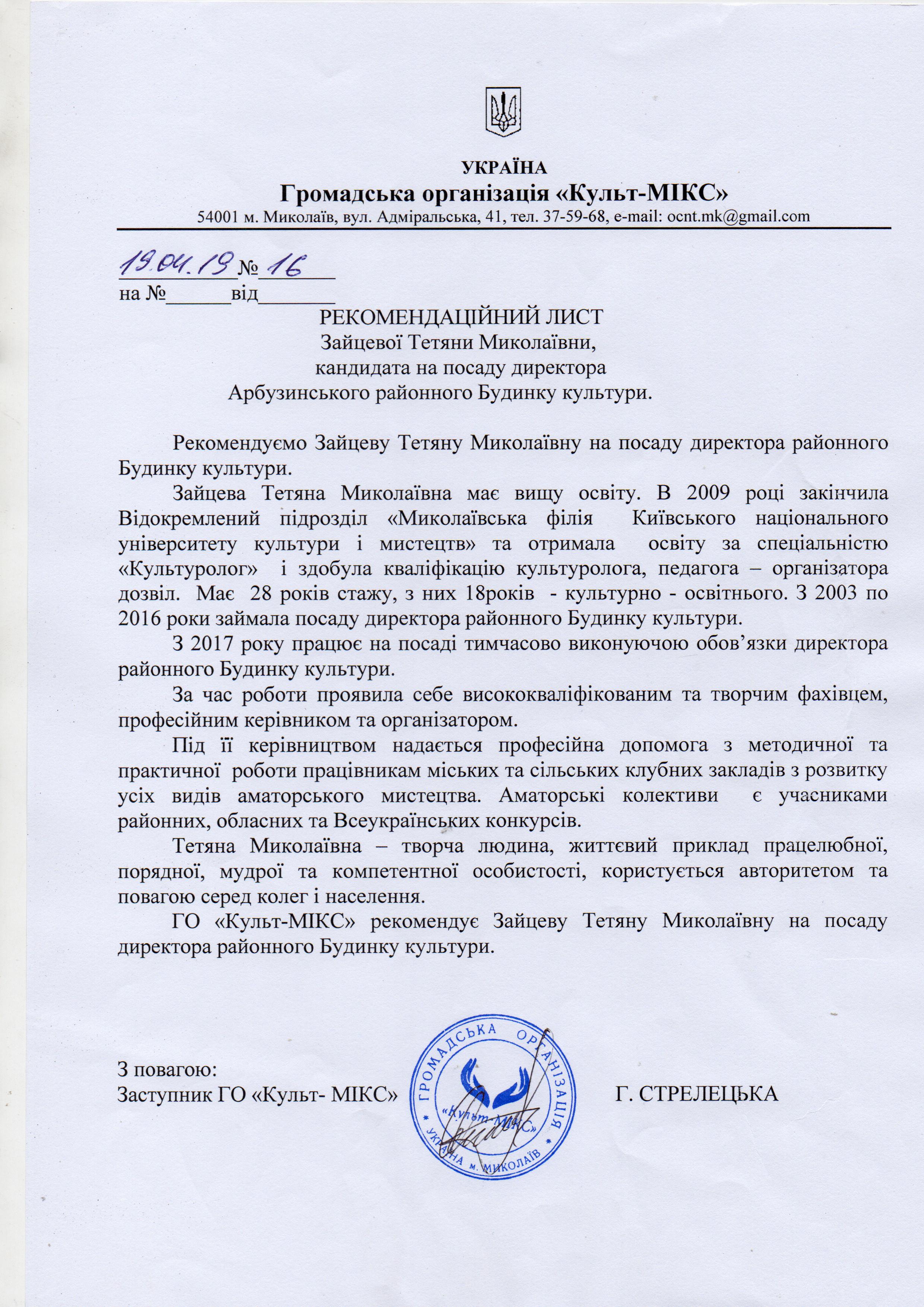 Документи конкурсанта на посаду директора районного Будинку культури Зайцевої Т.М.