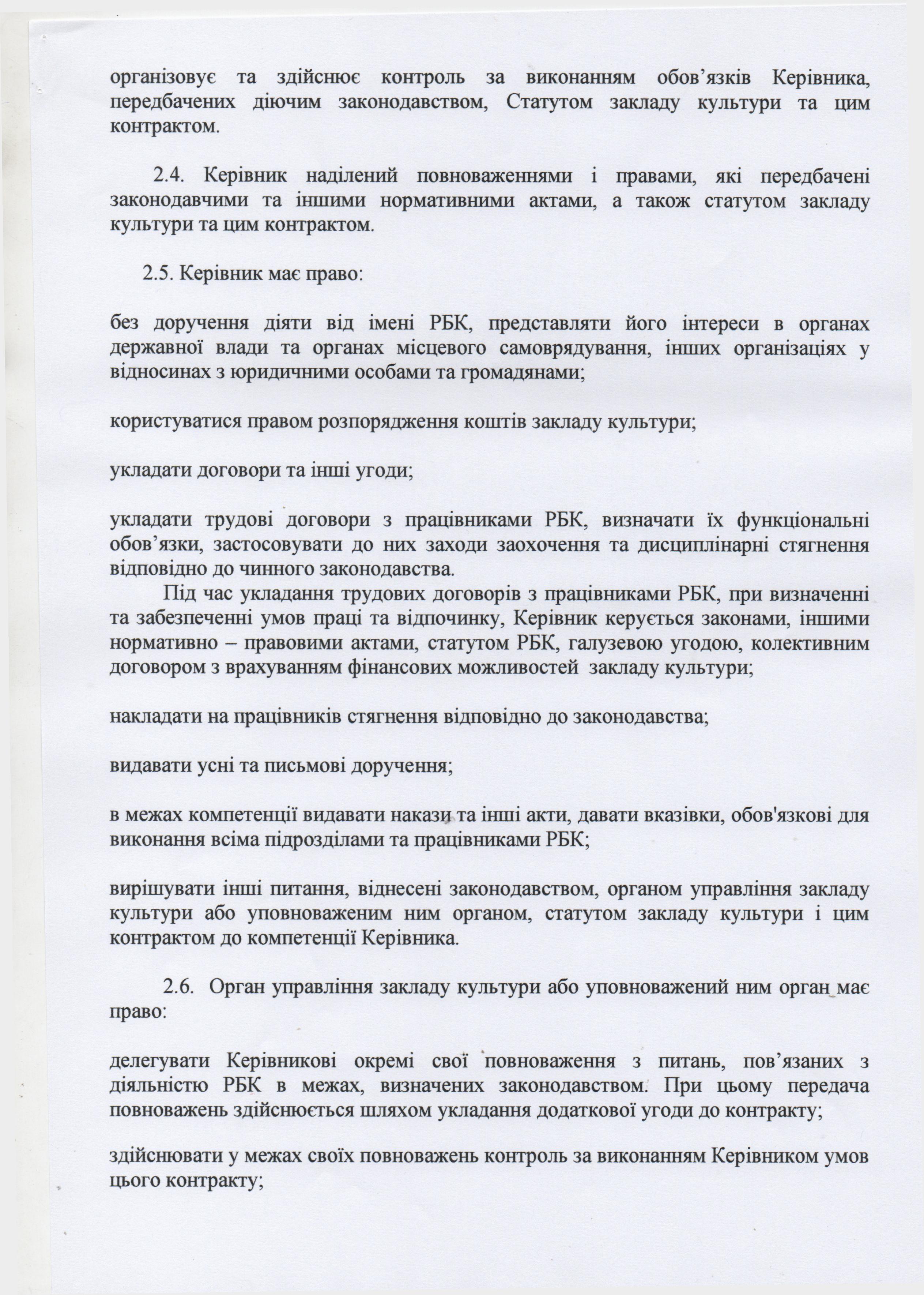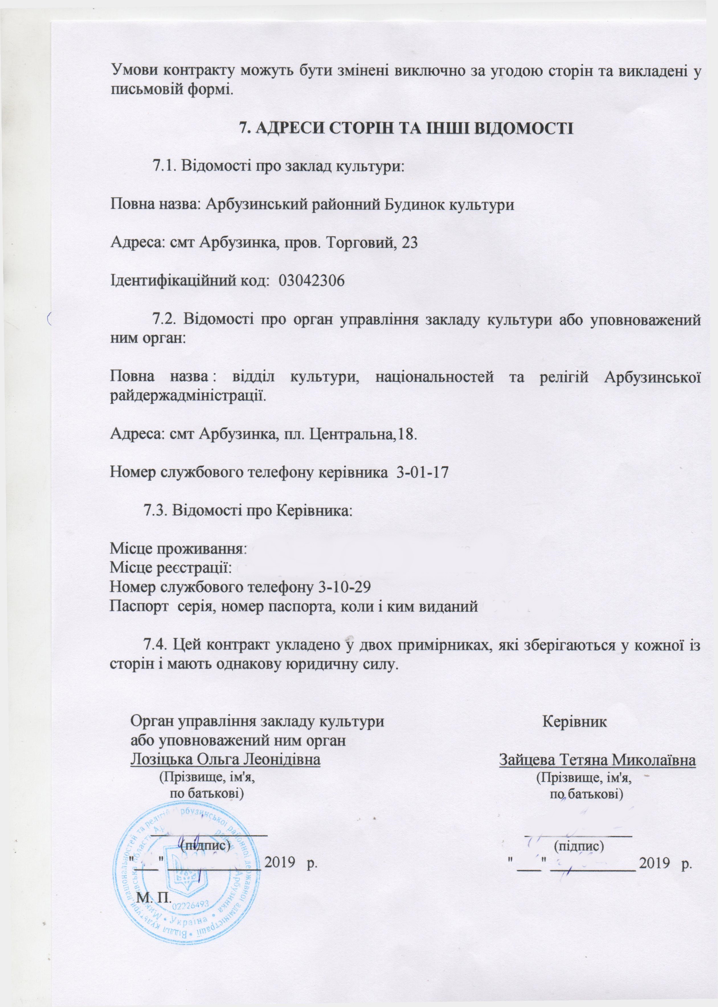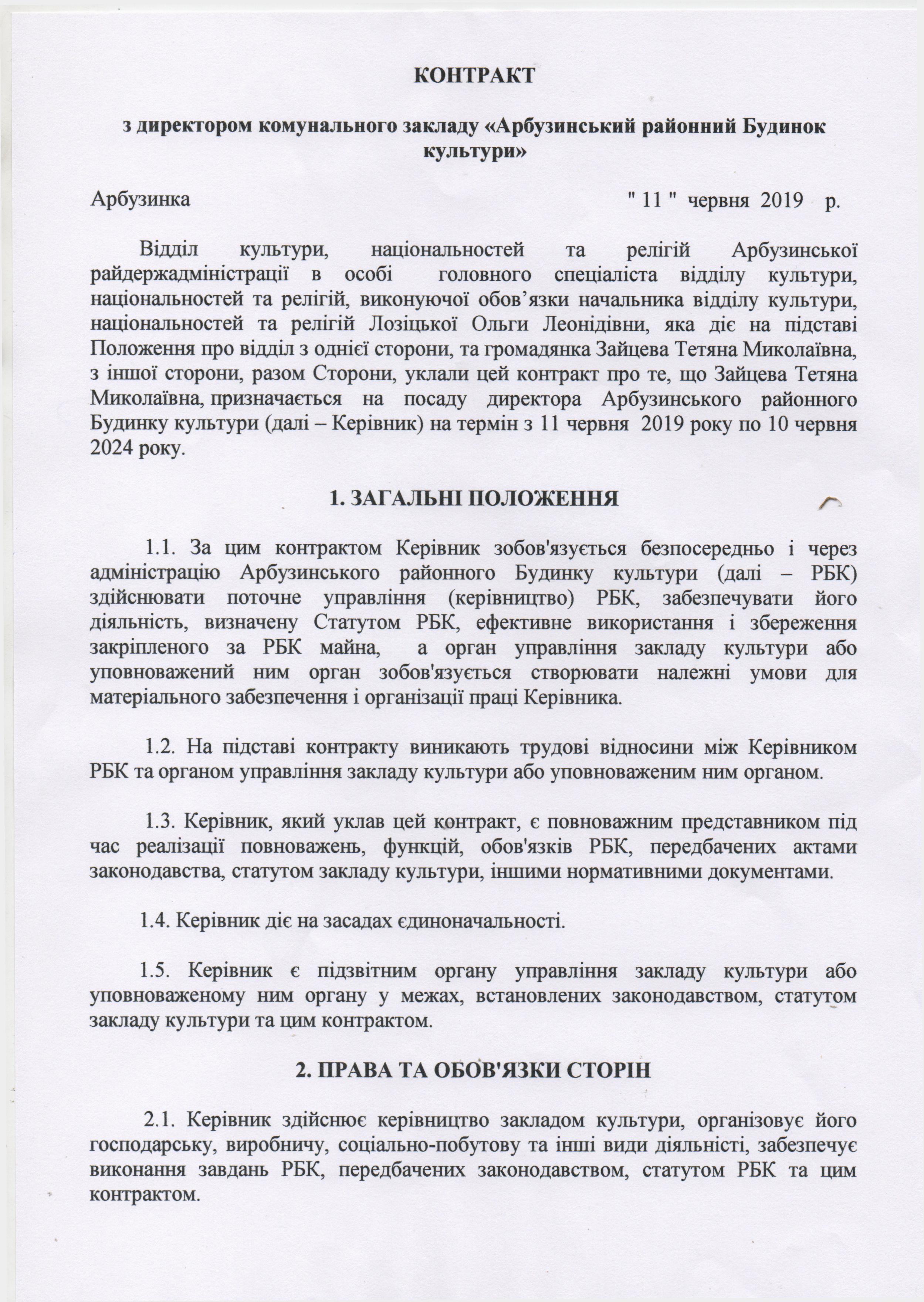 Контракт з директором комунального закладу Арбузинський районний Будинок культури