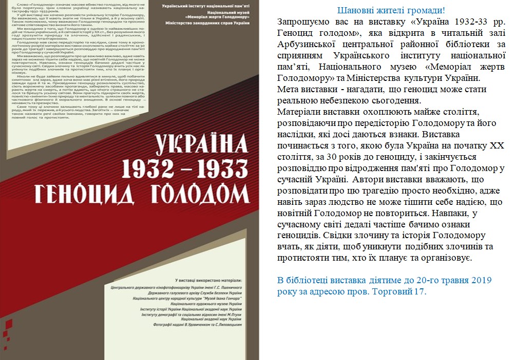 З 3 по 6 березня 2017 року в читальній залі Арбузинської центральної районної бібліотеки діє виставка українського інституту національної пам’яті « Люди свободи – гаранти незалежності », присвячена річниці незалежності України. На стендах розміщена інформація про 26 Людей Свободи, які своєю працею та боротьбою зробили її можливою.