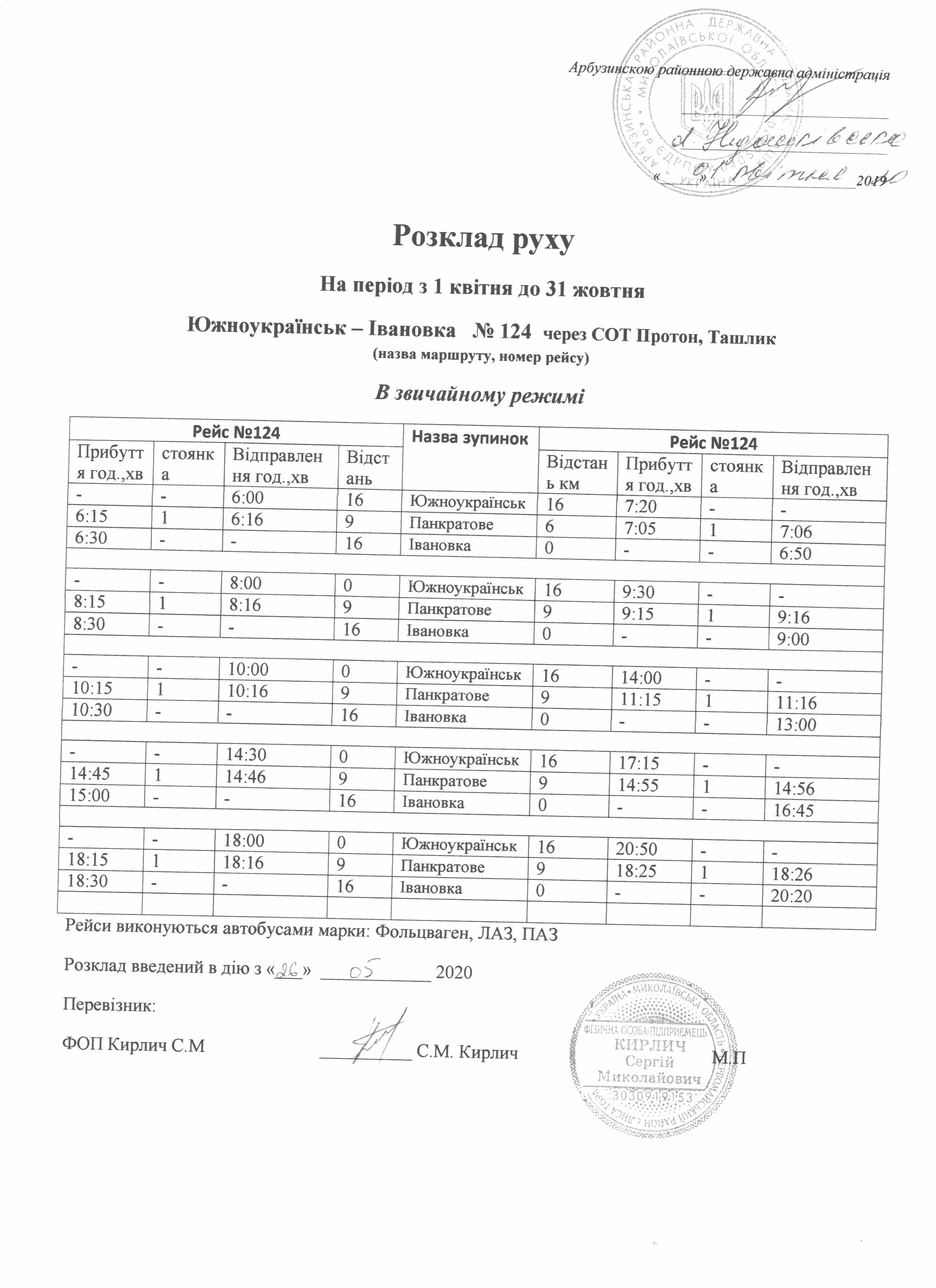 розклад руху по маршруту Южноукраїнськ - Іванівка №124 через СОТ Протон, Ташлик Формат: JPG | Добавлен: 23/08/2020 17:03:47 |